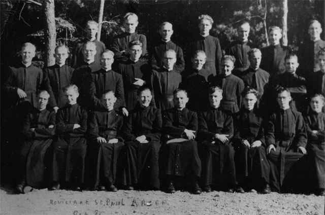 In juli 1950 kwam voor het eerst het eindexamen van de zesde klas na WO II. Allen slaagden en gingen enige dagen later op vakantie. Op het einde van deze vakantie schreef een van de klasgenoten Frans Lenssen, nu pater: zoals afgesproken hadden we op 2 september in een café in Gennep hun bijeenkomst om het ‘afscheid van de wereld‘ te vieren. Theo Koomen, was er niet bij omdat hij jarenlang voor TBC in een sanatorium was opgenomen. Hij zou ook niet meer terugkeren. Later is Theo een zeer bekende radiosportjournalist in Nederland geworden bij de KRO. (Katholieke Radio Omroep) Beroemd waren zijn ‘Tour de France’ verslagen. Hij had deze roeping al lang in zich. Op St. Paul had hij als hobby om tijdens voetbalwedstrijden langs de lijn luidkeels verslag te doen van de wedstrijd. Zelf was hij allesbehalve een sportman. In het café sloot zich een nieuwe metgezel aan, Gerard Stikkelbroek. Hij had gestudeerd bij de paters Passionisten en was daar in het noviciaat geweest. Na ons wat sterkte te hebben ingedronken reisden we naar St. Paul.De intrede en inkleding was op 7 september 1950, voorafgegaan door een retraite van 5 dagen. Tijdens een avondviering werden allen in het noviciaat opgenomen. Het was toen de gewoonte dat men een nieuwe naam kreeg. Na Vaticanum II is dit vervallen, alsmede het tonsuur en subdiaken wijding. De groep bestond uit 7 personen. Laurens van den Akker, Giel Warmerdam, Toon Lute, Gerard Stikkelbroek, Theo van de Kolk, Martien Duikers en Frans Lenssen. De novicen-meester was pater Polycarpus Versteijlen en z´n assistent Pater Marcel Noten. Zij waren de eerste groep priesterkandidaten sinds de laatste groep van Gerard Hafmans e. a. die nog tijdens de oorlog 1943/1944 in de nevengebouwen van St. Paul hun noviciaat hadden.