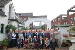 Na de soep en broodjes was het tijd voor de groepsfoto. Er werden diverse groepsfoto’s gemaakt, met en zonder partners. Omdat iedereen op een vroegere foto van een stel studenten in streepjespyjama in de slaapzaal bij de reünie aanwezig was, werd deze foto nu weer opnieuw gemaakt. Na de fotosessie wandelden we met z’n allen door Venray naar het vroegere klooster aan de Westsingel. In 50 jaar is Venray fors uitgebouwd en verstedelijkt. Onverwachts konden we ook het gebouw vanbinnen bekijken. De terugweg naar de Witte Hoeve liep via de plek waar vroeger de school van de Franciscanen stond en wij onze opleiding volgden. De school was intussen afgebroken en vervangen door een nieuwbouw flat. Bij terugkomst in de Witte Hoeve vertrokken de eerste gasten weer huiswaarts. Uitgebreid nam ieder met een tevreden gevoel afscheid. De mensen van de organisatie stelden na afloop met elkaar vast dat de dag volgens plan verlopen was en er sprake was van een levendige sfeer en tevreden bezoekers.