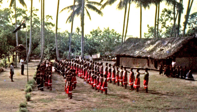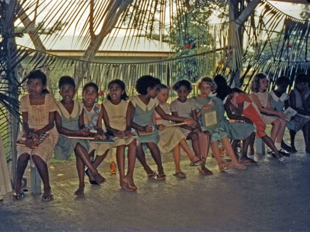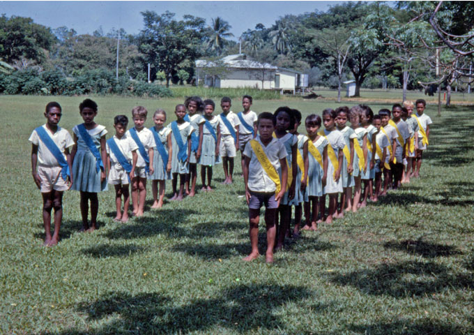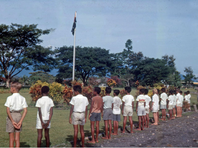 Het was een uitdaging om de school te leiden. De kinderen kwamen met kano ’s van hun dorp op Mandok. Bij aankomst kleedden ze zich om in hun school uniform. De jongens droegen blauw en de meisjes rood. Ze zagen er zo prima uit. Gelukkig, want ik had ze gemaakt door vele uren aan de trapnaaimachine te zitten. De dag begon met gebed en het zingen van het Australische volkslied: ‘God save the Queen’. Het paste niet in hun cultuur, maar het was verplicht om subsidie en salaris voor het personeel te krijgen. Ook moest er altijd Engels gesproken worden. Aangezien de leerlingen dit nauwelijks spraken, werd deze regel nogal eens genegeerd. Maar we spraken altijd Engels tijdens onze lessen, vaak onderbroken in ‘Pidgin’ de lokale taal in Nieuw Guinea.