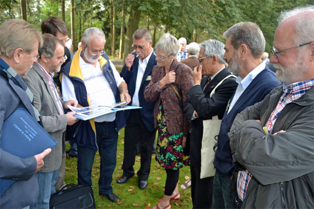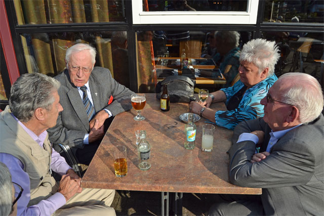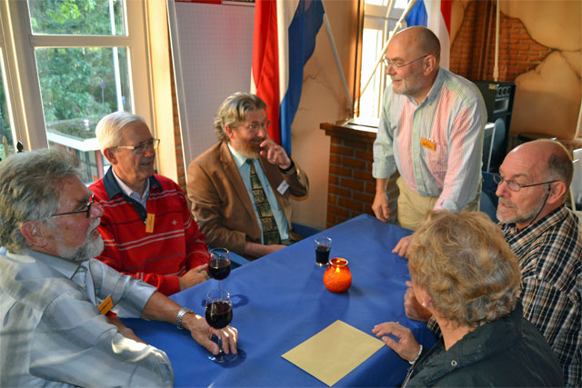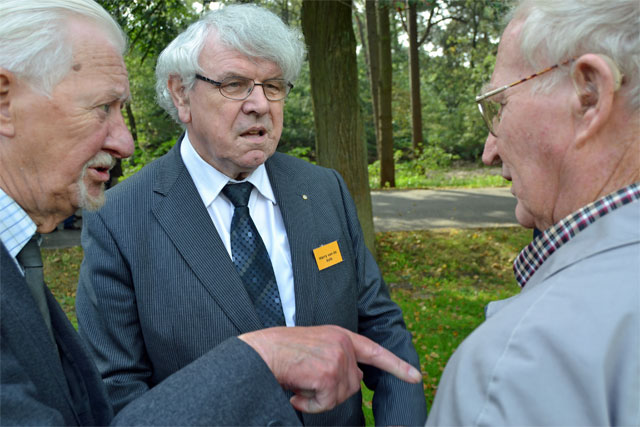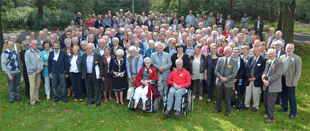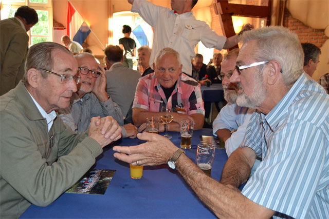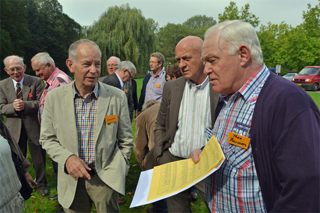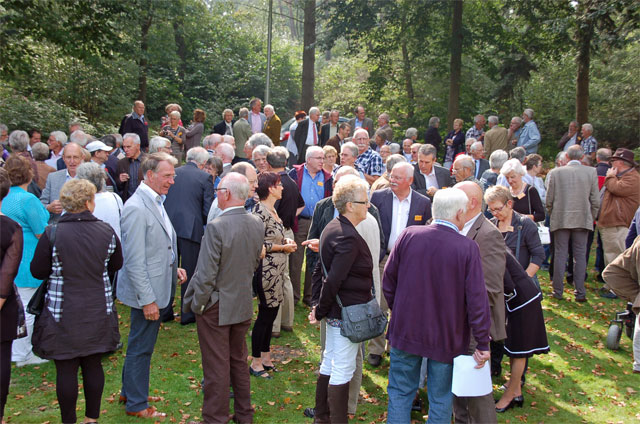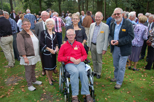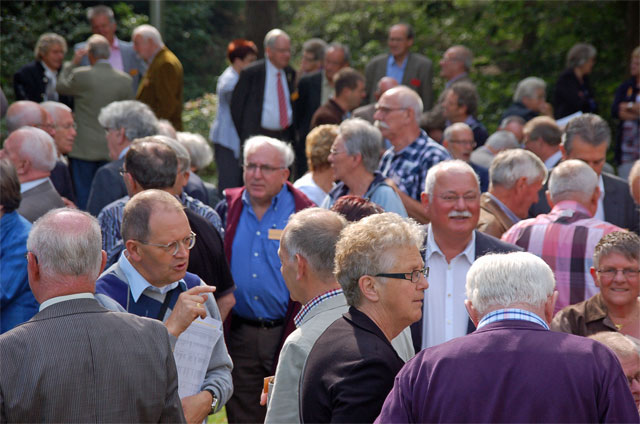 Tijdens de fotosessie buiten op het grasveld, kwamen de herkenningen. Er werd uitgebreid kennis genomen van ieders levensverhaal, al of niet ondersteund door de meegebrachte foto albums. Het enthousiasme en de vrolijk en lachende gezichten was alom aanwezig wanneer er ineens herkenning was, mede doordat de naam badges zichtbaar bleven. Aan de luide lach herkende men menig persoon. Bij elke verrassing werden de gesprekken luidruchtiger. Gelukkig was het een prachtige zonnige dag, zodat er ruimte genoeg was om te wandelen, te praten en kennismakingen te hernieuwen.