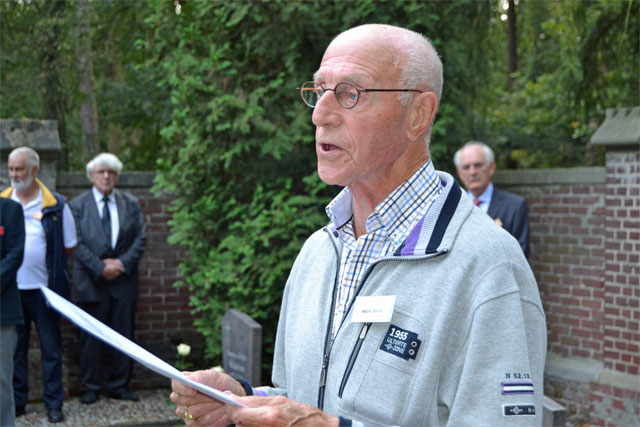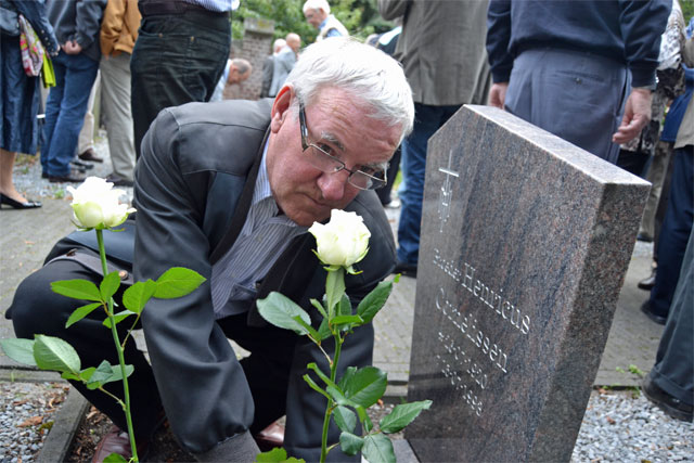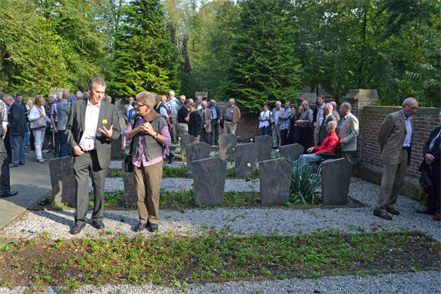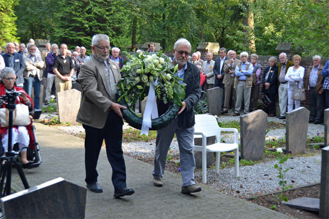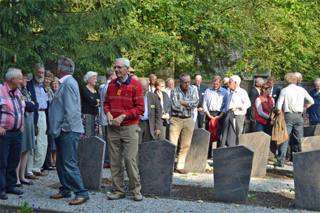 Het meest indrukwekkend tijdens deze reünie was voor de meesten toch wel de hommage op het kerkhof. Hier liggen ruim 70 oud docenten begraven: leraren, paters en broeders die ons opgeleid en begeleid hebben in onze jeugdjaren. Alle graven waren versierd met een grote witte roos. Als eerbetoon werd - Near to my Lord - (trompet) gespeeld. Vervolgens werd er een krans gelegd door twee reünisten. Een passend gedicht werd helder voorgedragen. Tot slot kon eenieder nog een persoonlijke rozengroet brengen aan diegene waarmee men een speciale band voelde. Daarna bleven velen geruime tijd, in groepjes bij de graven gedenken, herinneringen ophalen en belevenissen memoreren.