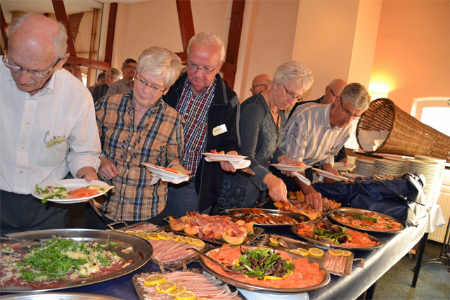 Van de uitermate gezellige en uitgebreide tafellunch werd met ca. 180 personen deelgenomen, waarvan er 140 in de grote zaal boven zaten en 40 beneden in het restaurant ‘De Kloosterhoeve’. De keuken en bediening aangestuurd door een prima gerant, bedienden ons voortreffelijk. De gerechten smaakten opperbest, de verse paling smolt op de tong. Van de gerant vernamen we dat er niet alleen gretig van het buffet gebruik werd gemaakt maar dat zeer velen heel goed met de inhoud van het glas overweg kon.Bezoek aan de expositie 100 jaar St. Paul door de reünisten