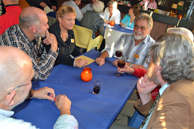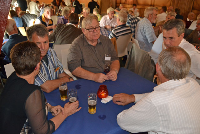Ruim een uur later waren allen weer bij de Kloosterhoeve op de terrassen in de warme herfstzon , waar men zich het frisse vocht zich heerlijk liet smaken om daarna de trappen te nemen naar de feestzaal om te dineren. Er was maar één klacht: wat vliegt de tijd snel.Afscheidsdiner